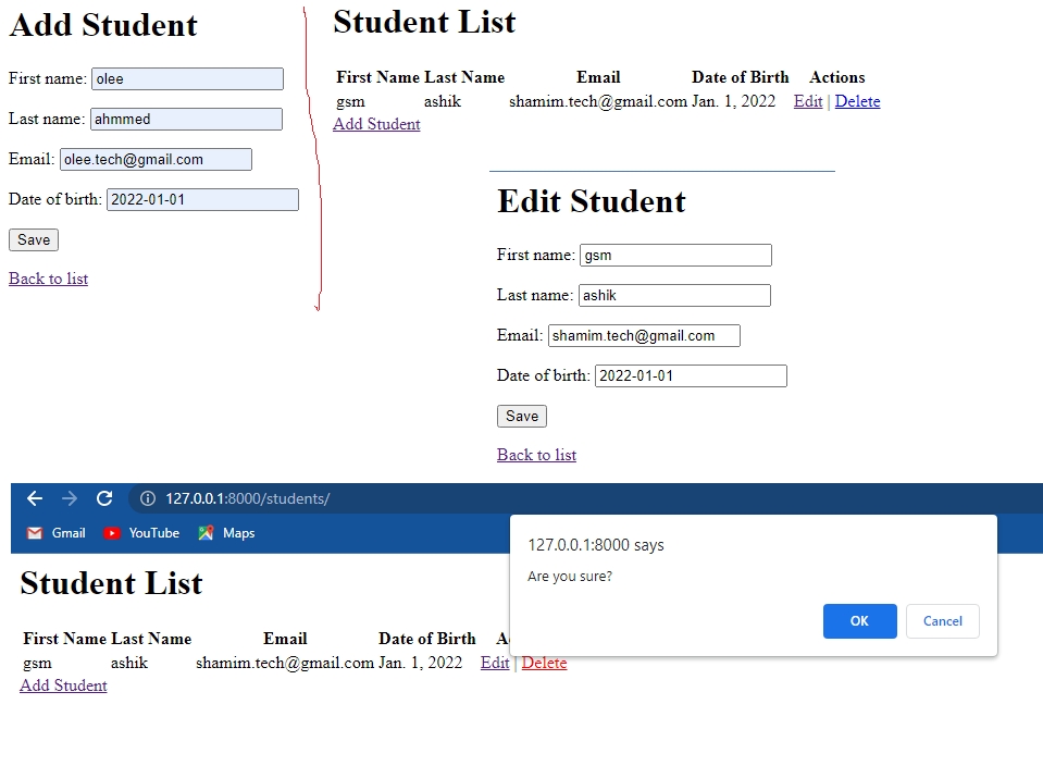 fields = ['first_name', 'last_name', 'email', 'date_of_birth']Create views: In the views.py file of the students app