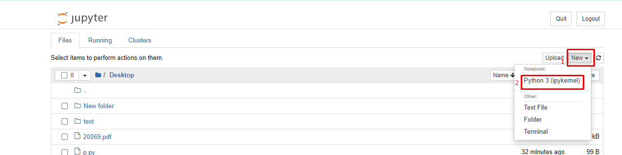 **NEW বাটনে ক্লিক করে python৩ সিলেক্ট করে test নামে একটি নোট তৈরী করি।**