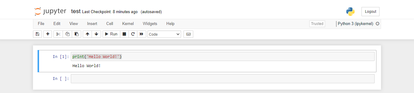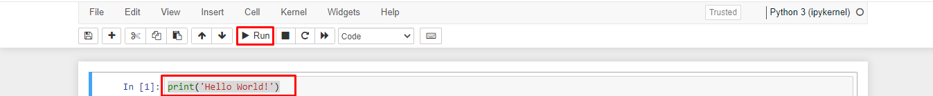 পাইথন print('Hello World!') লিখে Run বাটনে ক্লিক করি।  আবার "Shift + Enter " একসাথে বাটন চাপ দিলে কোডটি রান হবে।&#x20;