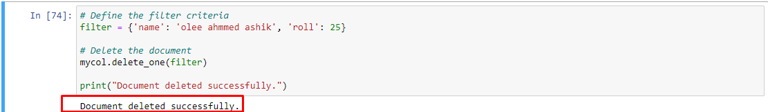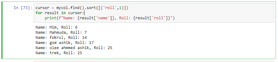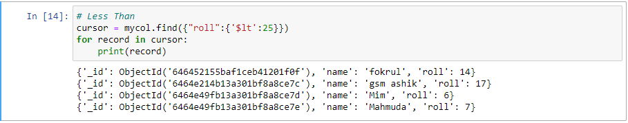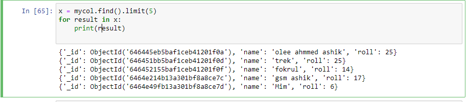 {'_id': ObjectId('6464e49fb13a301bf8a8ce7e'), 'name': 'Mahmuda', 'roll': 7}'''