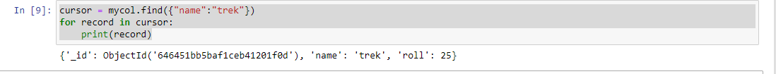 {'_id': ObjectId('646451bb5baf1ceb41201f0d'), 'name': 'trek', 'roll': 25}