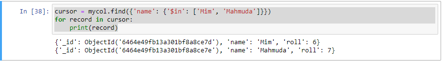 cursor = mycol.find({'name': {'$in': ['Mim', 'Mahmuda']}})