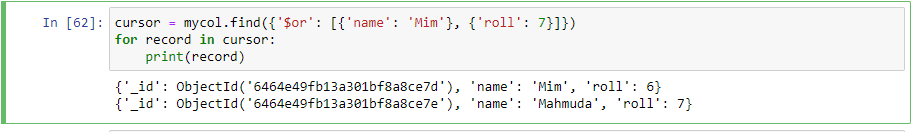 cursor = mycol.find({'$or': [{'name': 'Mim'}, {'roll': 7}]})