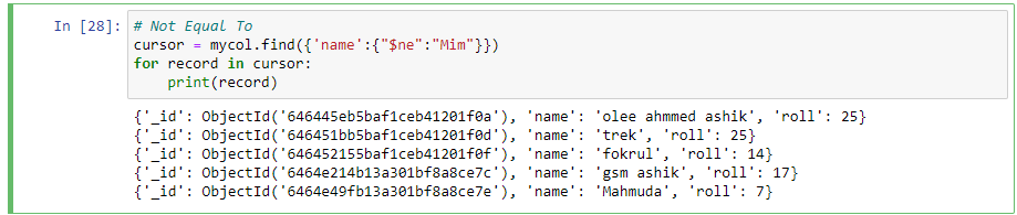 cursor = mycol.find({'name':{"$ne":"Mim"}})